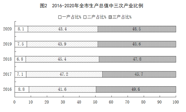 初步核算,全年全市实现生产总值1034.6亿元,按不变价格计算,比上年增长4.0%。其中,第一产业增加值84.2亿元,增长3.6%,占生产总值的比重8.1%;第二产业增加值448.5亿元,增长6.4%,占生产总值的比重43.4%;第三产业增加值501.9亿元,增长2.3%,占生产总值的比重48.5%。