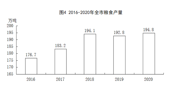 全年全市粮食产量194.8万吨,比上年增产2万吨,增长1.1%。其中,秋粮194.7万吨,增长1.0%。
