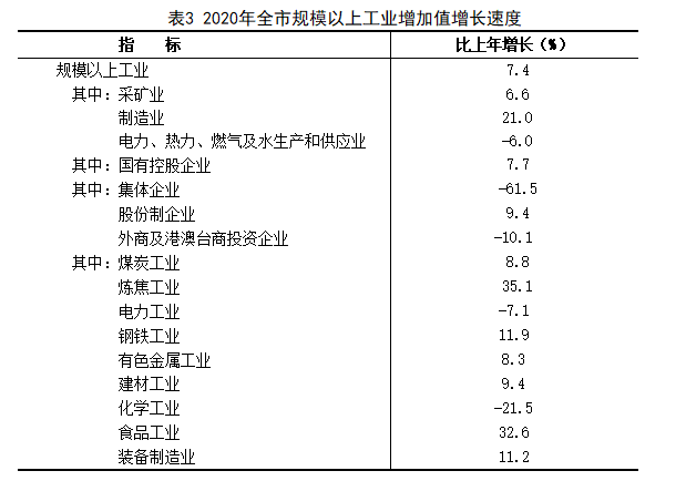 全年全市规模以上工业增加值增长7.4%。其中,煤炭工业增加值增长8.8%,非煤工业增加值增长6.3%。其中,采矿业增长6.6%,制造业增长21.0%,电力、热力、燃气及水生产和供应业下降6.0%。