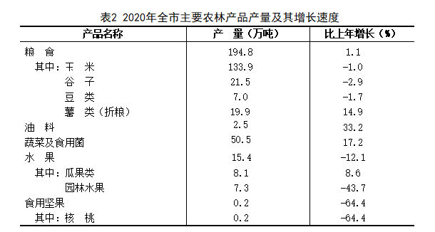 全年全市农作物种植面积470.8千公顷,比上年增加3.6千公顷。其中,粮食种植面积428.3千公顷,增加2.7千公顷;油料种植面积11.8千公顷,减少1.7千公顷;中草药材种植面积5.1千公顷,增加0.8千公顷;蔬菜种植面积19.2千公顷,增加1.8千公顷。在粮食种植面积中,玉米种植面积207.6千公顷,减少13.6千公顷。果园面积16.0千公顷,减少0.7千公顷。