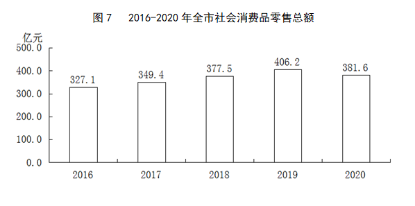 全年全市社会消费品零售总额381.6亿元,比上年下降6.0%。按经营地统计,城镇消费品零售额262.2亿元,下降6.6%;乡村消费品零售额119.4亿元,下降4.8%。按消费类型统计,商品零售额358.1亿元,下降5.3%;餐饮收入23.5亿元,下降16.5%。