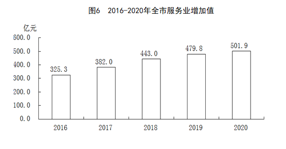 全年全市服务业增加值501.9亿元,按不变价格计算,比上年增长2.3%。其中,批发和零售业增加值50.2亿元,增长2.8%;交通运输、仓储和邮政业增加值61.3亿元,增长2.9%;住宿和餐饮业增加值12.1亿元,下降15.6%;金融业增加值69.5亿元,增长3.7%;房地产业增加值63.9亿元,增长4.9%。