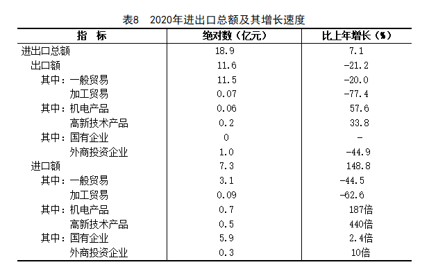 全年全市进出口总额18.9亿元,增长7.1%。其中,进口额7.3亿元,增长148.8%;出口额11.6亿元,下降21.2%。