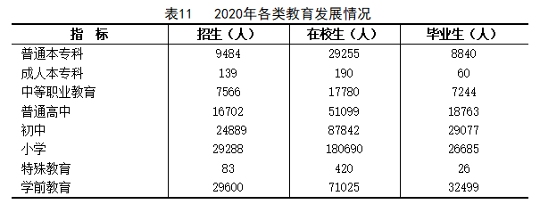年末全市共有幼儿园472所,小学405所,普通初中188所,普通高中37所,中等职业教育学校33所,普通高等学校3所,成人高等学校2所。全市学前教育毛入园率95%,小学学龄儿童净入学率99.9%,高中阶段毛入学率95%。
