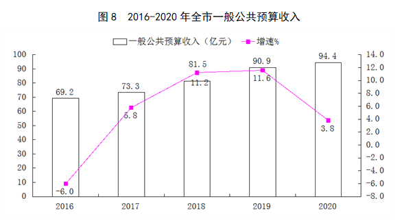 全年全市一般公共预算收入完成94.4亿元,比上年增长3.8%。税收收入完成61.9亿元,增长3.1%,其中,国内增值税、企业所得税、个人所得税、资源税和城市维护建设税共计完成税收48.9亿元,下降2.3%。