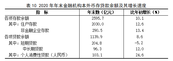 年末全市金融机构本外币各项存款余额2595.7亿元,比年初增加237.7亿元,比年初增长10.1%。各项贷款余额1139.9亿元,比年初增加90.1亿元,增长8.6%。