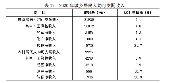 全年全市居民人均可支配收入19637元,比上年增长6.4%,居民人均消费支出12093元,比上年增长6.9%;城镇居民人均可支配收入31920元,增长5.1%,城镇居民人均消费支出17290元,增长6.8%;农村居民人均可支配收入9926元,增长8.1%,农村居民人均消费支出8390元,增长7.0%。按全市居民五等份收入分组,城镇低收入组人均可支配收入11989元,增长6.5%;农村低收入组人均可支配收入3292元,增长10.7%。